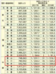2017年における免許人口当たりの事故発生率データでは、北陸3県は少ないように見えます。